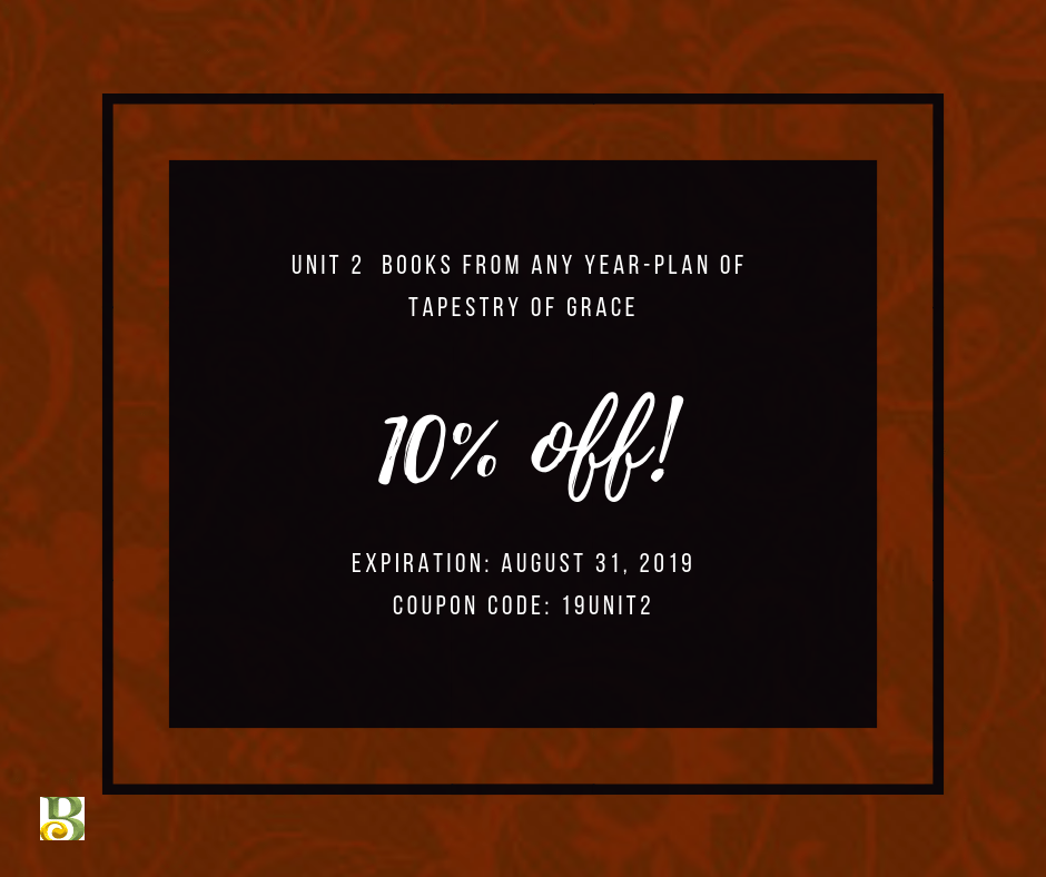 Do you use Tapestry of Grace? If so, you might be interested in saving 10% off of books for Unit 2 from any year-plan. All you need to do is enter code 19UNIT2 at checkout and the percentage will automatically be deducted from your order. This code expires the last day of August, so don't forget!
