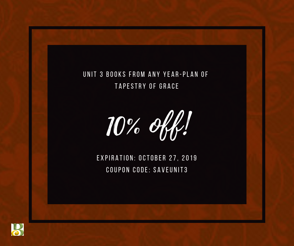 Tapestry of Grace families can save 10% on books for Unit 3 from any year-plan. Enter coupon code SAVEUNIT3 at checkout. This offer is good until October 27, 2019.Please be watching future emails and social media for sales and special products. We are gearing up to help you buy Christmas gifts!